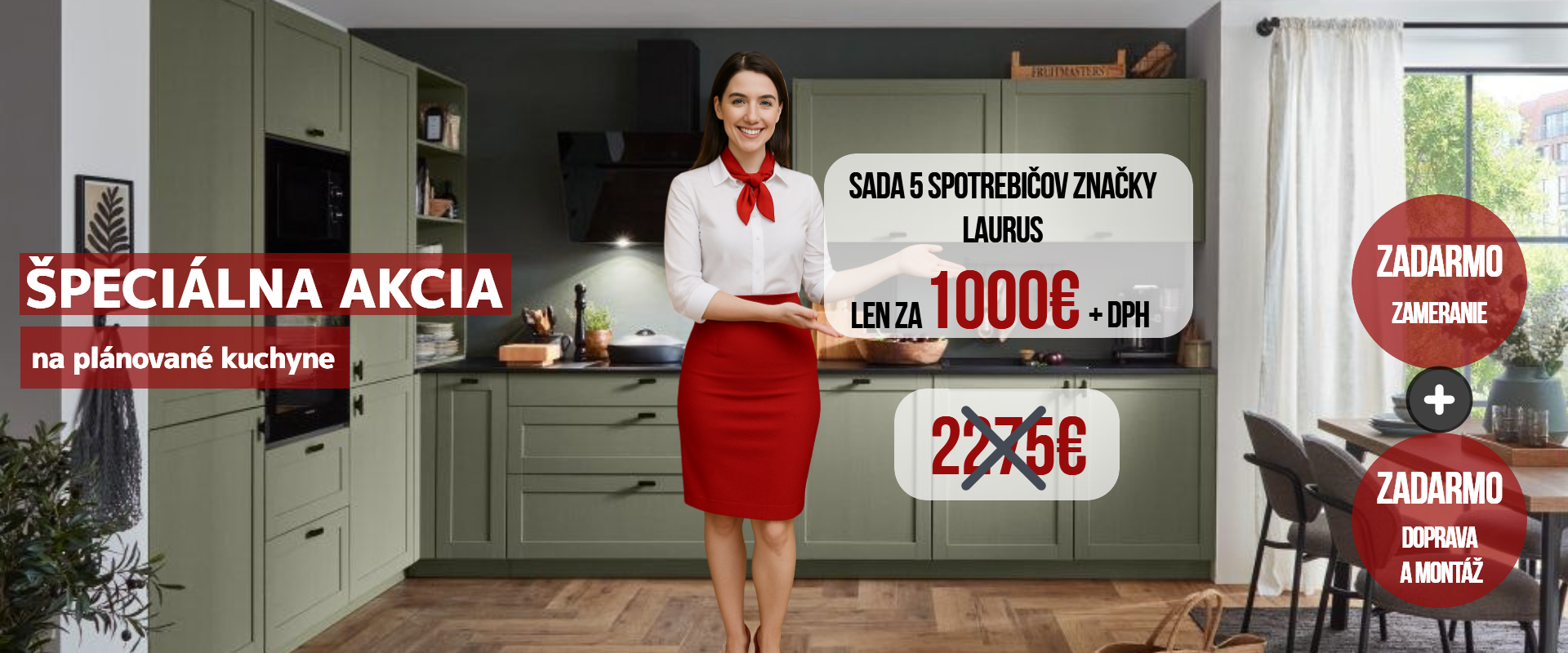 Zľava 60 % na plánované kuchyne značky Nobilia + ZADARMO zameranie, doprava a montáž pri nákupe plánovanej kuchyne v hodnote bez elektrospotrebičov nad 3.000 € + ZADARMO umývačka riadu sa vzťahuje na nezáväzné odporúčané ceny. Zameranie, dopravu a montáž ZADARMO možno uplatniť len pri nákupe plánovanej kuchyne Nobilia v hodnote nad 3.000 € bez spotrebičov. Umývačka riadu zdarma sa vzťahuje na kolekciu umývačiek riadu od výrobcu značky LAURUS. ZADARMO je ponúknutá vždy z rovnakej alebo približnej modelovej rady. Po uplatnení zľavy nemôžu byť poskytnuté žiadne dodatočné zľavy. Akcia platí do 31. 10. 2025 len na novo uskutočnené objednávky a len v predajni na Račianska 26G, Bratislava.